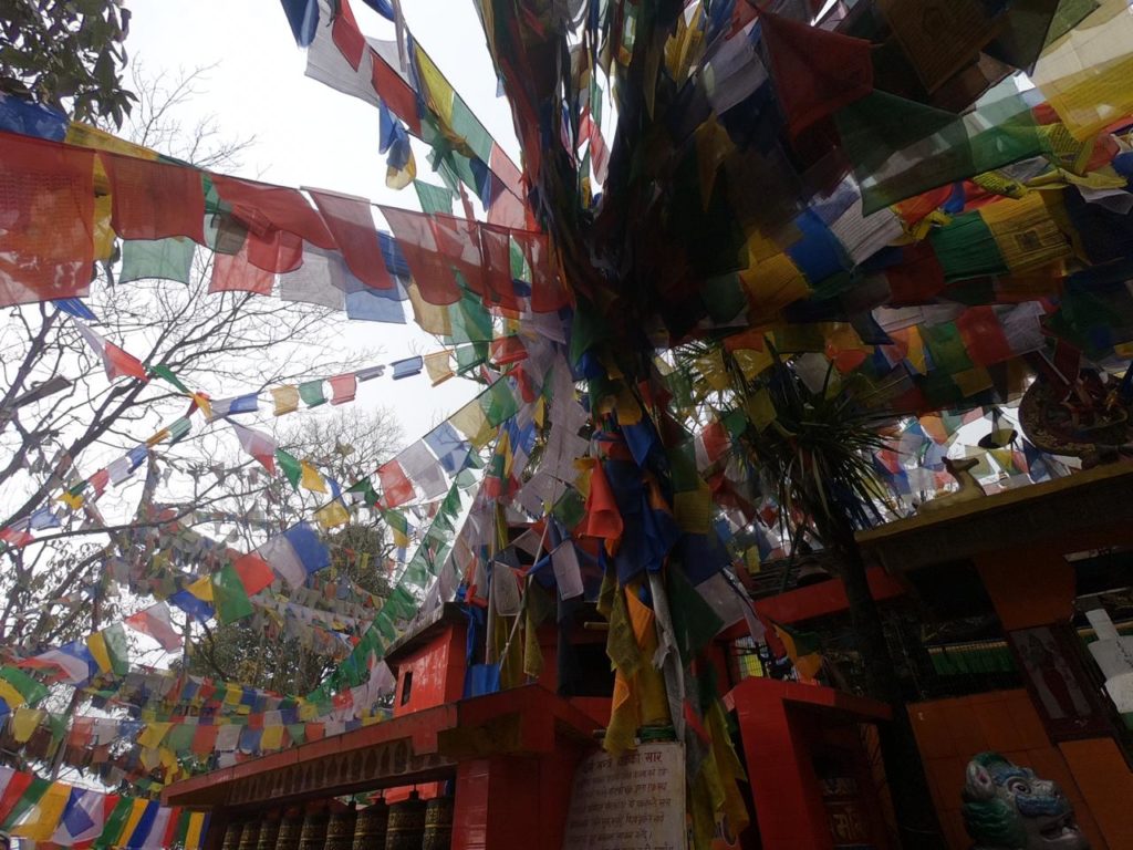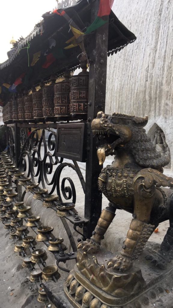 Einer unserer ersten weiteren Ziele war der Affentempel Swayambhunath. Oft hängen überall bunte Fahnen mit Schriftzeichen. Dies sind buddhistische Gebete, Mantras und auch Wünsche, die von dem Wind davongetragen werden sollen. Außerdem sieht man öfter Gebetsmühlen (Rollen mit Schriftzeichen, die sich drehen lassen). Im Inneren befinden sich Schriftrollen mit den wichtigsten Mantras. Beim Beten werden diese gesprochen und gleichzeitig wird die Gebetsmühle gedreht, damit auch die Schriftrolle im Inneren in Bewegung kommt. Das soll gutes Karma bewirken und auch helfen, dass die Mantras in Erfüllung gehen.