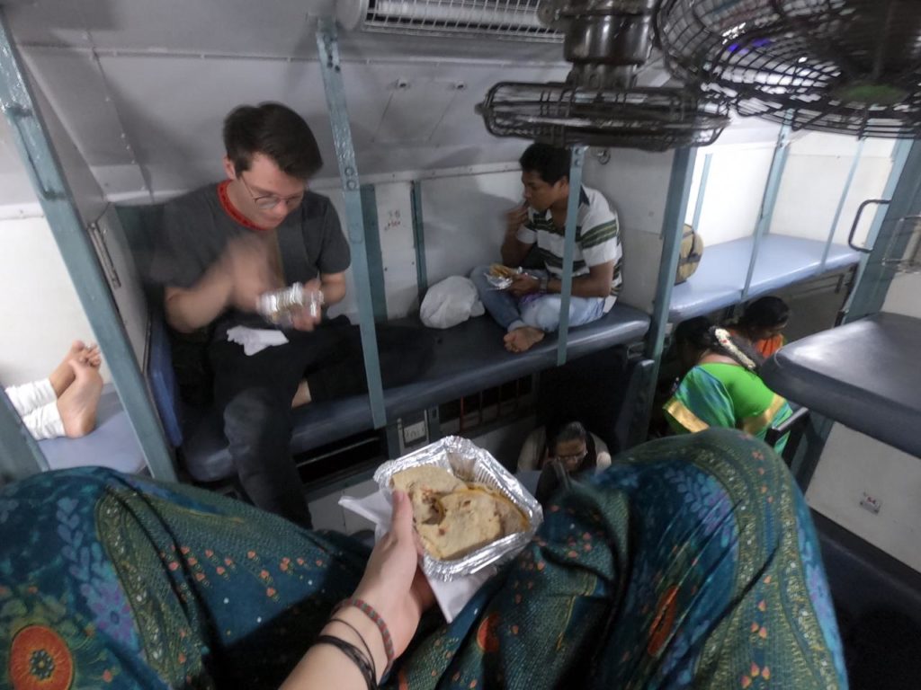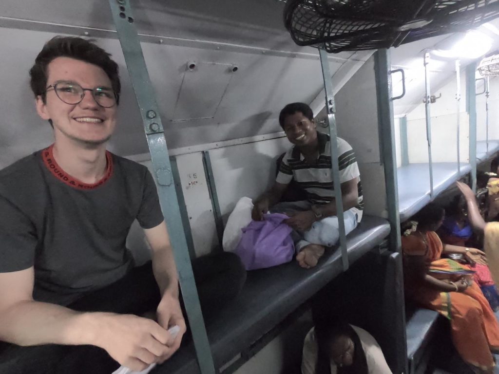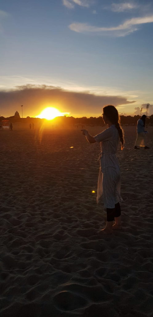 Der Marina Beach liegt an der Ostküste Indiens am Golf von Bengalen. Der Strand ist sehr lang und breit und man braucht eine Weile, bis man am Wasser angekommen ist. Aber dadurch strahlt dieser Strand ein Gefühl von Unendlichkeit aus. Wir hatten Glück, denn es war gar nicht so voll und auch nicht schmutziger als die gewohnten Strände in Deutschland und so. In Indien kann man übrigens nur in Goa im Bikini sicher schwimmen gehen. Überall geht man einfach mit Kleidung ins Wasser. Allerdings haben wir darauf verzichtet. Die Sonne konnten wir an der Ostküste leider nicht über dem Wasser beim Untergehen beobachten. Doch der Sonnenuntergang war trotzdem schön und wir haben die Golden Hour für Fotos genutzt. Sobald es dunkel wurde, haben wir uns in Richtung Bahnhof bewegt. Dabei sind wir zu einem Markt am Strand gekommen, haben ihn aber auf der Stelle wieder verlassen, weil mein Magen für dieses Geruchserlebnis noch nicht wieder stark genug war. Vom falschen Bahnhof aus sind wir dann zum richtigen gefahren und sind in Richtung Unterkunft umgestiegen. Da wir etwas Zeitnot hatten und so schnell wie möglich einsteigen wollten, haben wir den Fehler gemacht, uns in den ersten Wagen zu setzen. Dieser war schon nach kurzer Zeit völlig überfüllt und wir hatten Mühe da wieder rauszukommen.