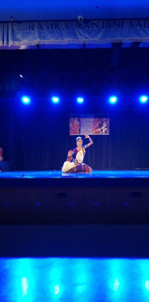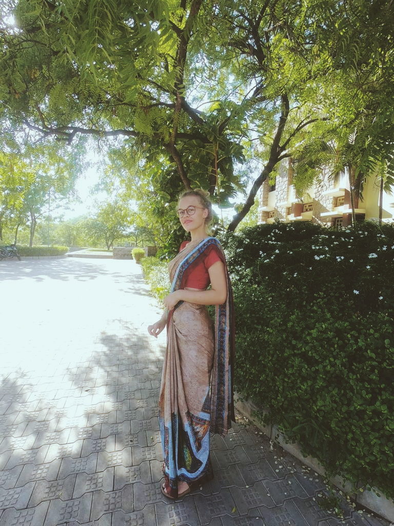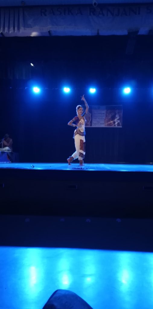 Am nächsten Morgen sind wir zusammen mit den Fathers zu einer Tanzveranstaltung gefahren. Diese war auch der eigentliche Grund für unseren Besuch in Chennai. Denn die eine Tänzerin war über Ecken mit Fr Emmanuel verwandt und mit dieser Aufführung hat sie ihren Abschluss überreicht bekommen. Ela und ich mussten zu diesem Anlass einen Sari tragen, was mich erst ein bisschen verzweifeln lassen hat. Ich kann den Sari nämlich immer noch nicht alleine binden und ohne Lakshmi, die mich sonst jeden Morgen einwickelt oder meine kläglichen Versuche verbessert, wusste ich nicht, wie ich das schaffen sollte. Doch Ela hat mir freundlicherweise geholfen. Wir haben uns sogar einen Pottu (Ich glaube im Norden wird der auch Bindi genannt.) aufgeklebt. Das ist der Schmuck, den Frauen sich zwischen die Augenbrauen aufkleben oder aufmalen und der keine religiöse Bedeutung hat. Am Anfang hat es sich total komisch angefühlt, doch nach kurzer Gewöhnungsphase habe ich Gefallen an dem Glitzersteinchen gefunden und werde das demnächst bestimmt noch öfter tragen.