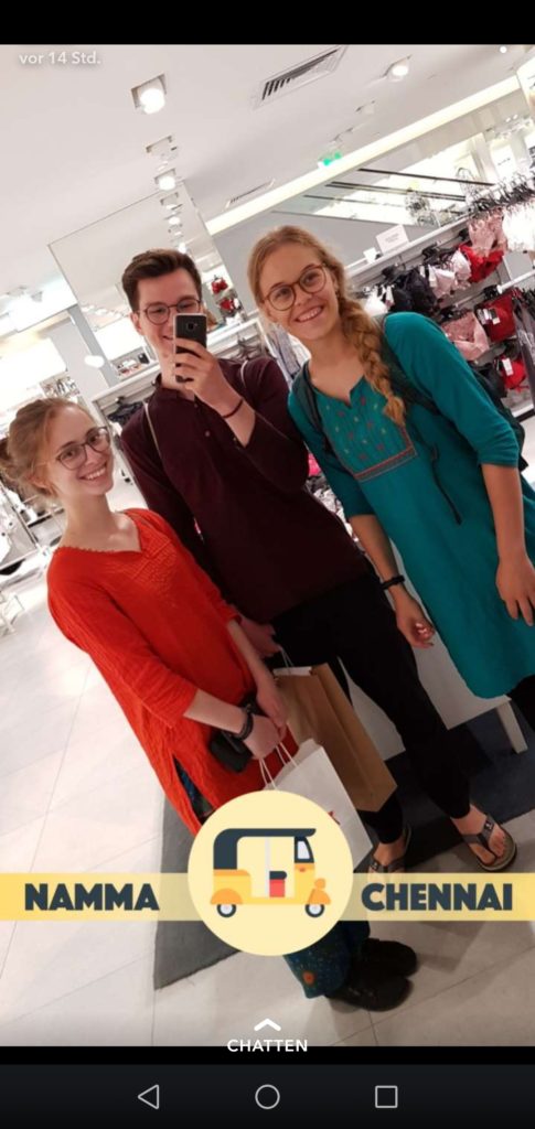 Nach kurzer Verschnaufpause sind wir noch am gleichen Tag mit der Metro in die Stadt gefahren, um uns in einer Mall auszutoben. In dem riesigen Einkaufsparadies hatte ich kaum noch das Gefühl, in Indien zu sein. Denn viele der Geschäfte kannte ich aus Deutschland und Amerika und die Menschen, die dort einkauften, trugen hauptsächlich westliche Kleidung. Wir wurden kaum angesprochen und in den Läden war der Service zwar noch ausgeweiteter als in Deutschland, allerdings standen nicht die ganze Zeit fünf Frauen um mich herum, die mir ständig Sachen anbieten.(In Madurai kommt es häufig in den Läden vor, dass sie ständig das gesamte Sortiment vor mir ausbreiten und die Sachen meistens absolut nicht meinem Geschmack entsprechen.) Ich konnte mich in der Mall ein bisschen entspannen, denn ich sah mich für den Moment nicht als Paradiesvogel, sondern bekam das Gefühl, ein Teil der Masse zu sein. Außerdem konnten wir auch sicher lange draußen bleiben, sodass nicht der Druck auf mir gelastet hat, vor dem Sonnenuntergang wieder zurück zu sein. Zurück sind wir einen Teil der Strecke mit dem Zug im Nahverkehr gefahren, die sind immer absolut überfüllt und in den ersten Wagons hängt so manch ein Inder aus der Tür heraus. Also immer hinten einsteigen! (Sorry für die Screenshots)