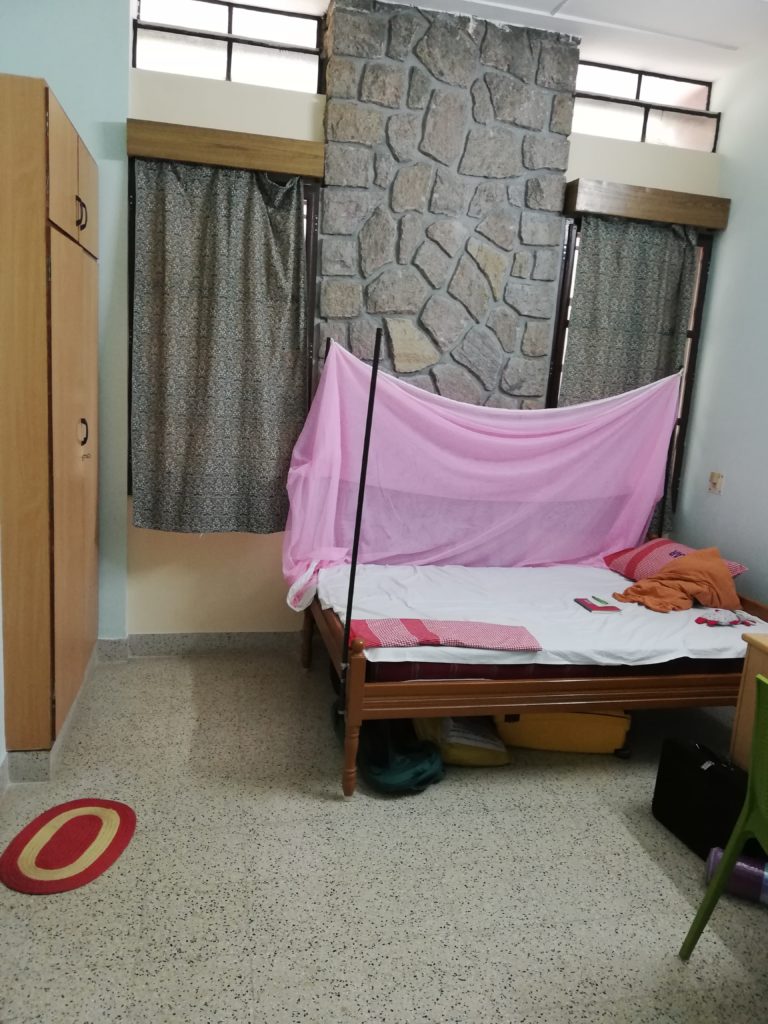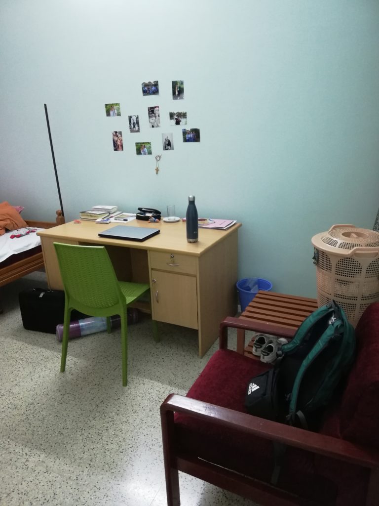 Mein Zimmer ist sehr schlicht und einfach gehalten und hat einen direkten Anschluss zu meinem eigenen Badezimmer. Ich habe auch versucht mit Fotos ein bisschen zu dekorieren und finde es jetzt auch ganz gemütlich. Für einen Tag hatte ich sogar eine kleine Eidechse als Zimmergenossen im Badezimmer. Allerdings ist sie spurlos verschwunden.