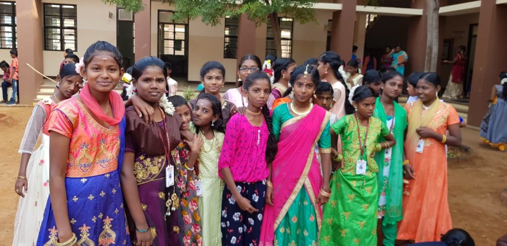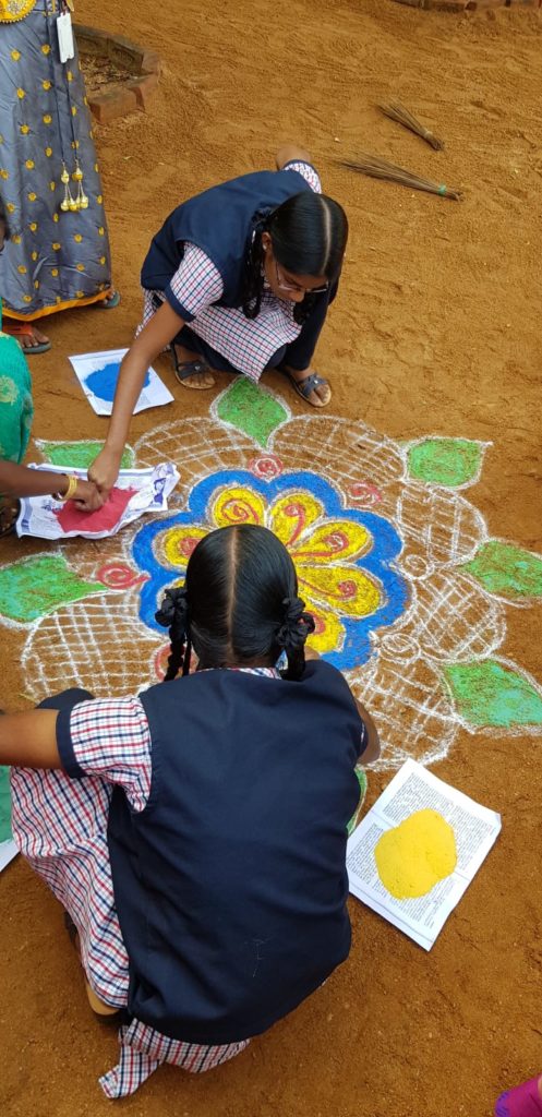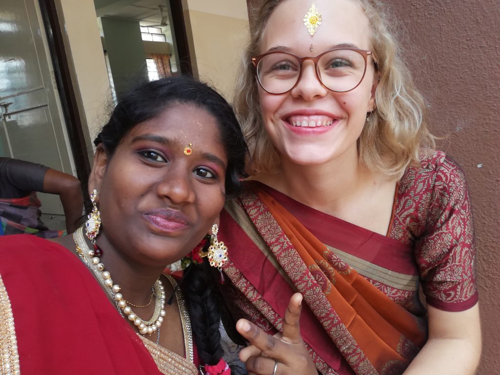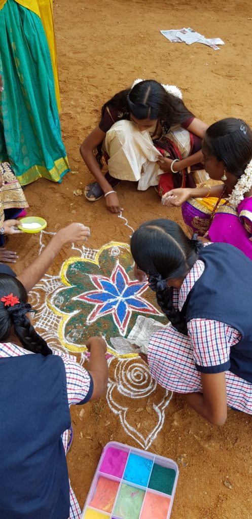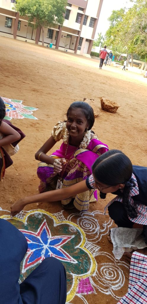 Am Montag war zwar offiziell noch kein Pongal, aber bei uns in der Schule wurde trotzdem das Fest gefeiert. Jeder durfte seine „normale“ Kleidung tragen. Sprich die Kinder durften die Schuluniform weglassen und die Lehrer mussten nicht den Montagssari anziehen, sondern konnten frei wählen. Auch die Haare durften offen getragen werden. Nur die zwölfte Klasse hat sich freiwillig dazu entschieden, die Uniform zu tragen, da sie später am Tag noch Exams schreiben mussten. Fast alle Mädchen haben sich sehr viel Mühe mit Ihrem Aussehen gegeben und auch ich wurde beim Betreten des Schulhofes gleich von ein paar Mädchen entführt und geschmückt. Neben einem Sticker auf die Stirn gab es noch welche in die Haare mit gaaaanz viel Glitzer. Natürlich durfte die Blumen im Haar auch nicht fehlen.