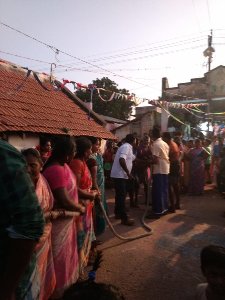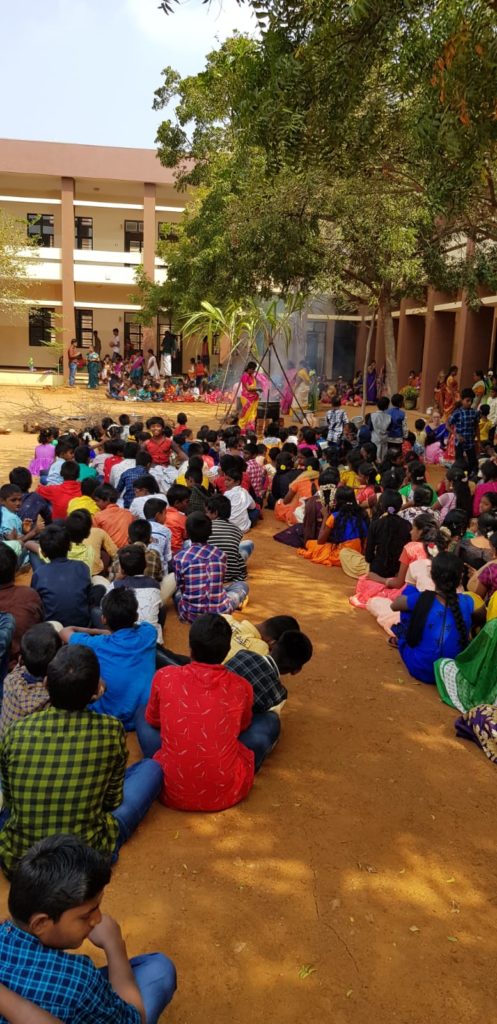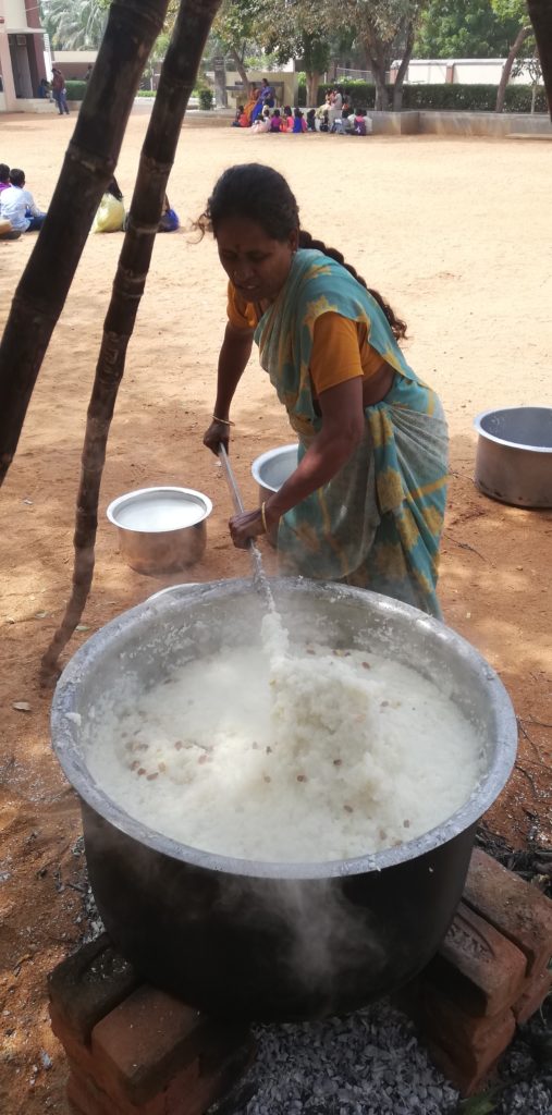 Während alle darauf gewartet haben, dass das (keine Ahnung, ob ich den richtigen Artikel verwende) Pongal fertig gekocht wird, haben die Schüler ein kleines Programm mit Tanz und Gesang zur Unterhaltung vorbereitet. Außerdem gab es für die Jungs noch ein Spiel mit dem Namen Uriyadi. „Uri“ bedeutet so viel wie Topf und „adi“ schlagen. Zwischen Gebäude und Bäumen wurde ein Topf gefüllt mit Wasser und Blüten aufgehängt und die Jungs mussten mit einem Schlagstock versuchen, diesen zu zerstören. Vorher bekamen sie ihre Augen verbunden und wurden im Kreis gedreht. Unter anderem haben auch die drei männlichen Freiwilligen leider erfolglos ihr Glück probiert.