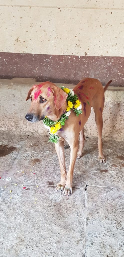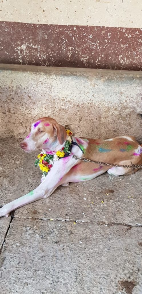 Wir haben diesen Tag mit den Arbeitern bei uns im Haus gefeiert. Die Tiere wurden mit Farbe bemalt und mit Blumen geschmückt. Während die Kühe sich absolut darüber gefreut haben und sich genüsslich gegenseitig über ihre Blumen hergemacht haben, saß manch ein Hund nur noch bedröppelt vor sich hin. Die Schweine zeigten bis es Fressen gab keinerlei Reaktion. Auch für die Tiere sollte es Pongal geben und nach einem kurzen Gottesdienst wurde das Essen unter ihnen verteilt. Auch an diesem Tag sollte es für uns wieder Zuckerrohr geben.