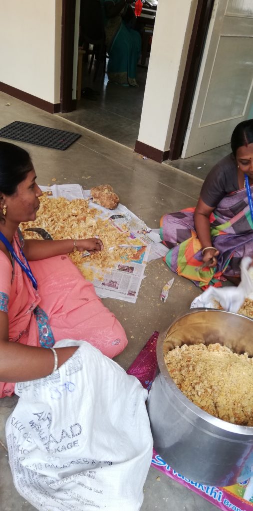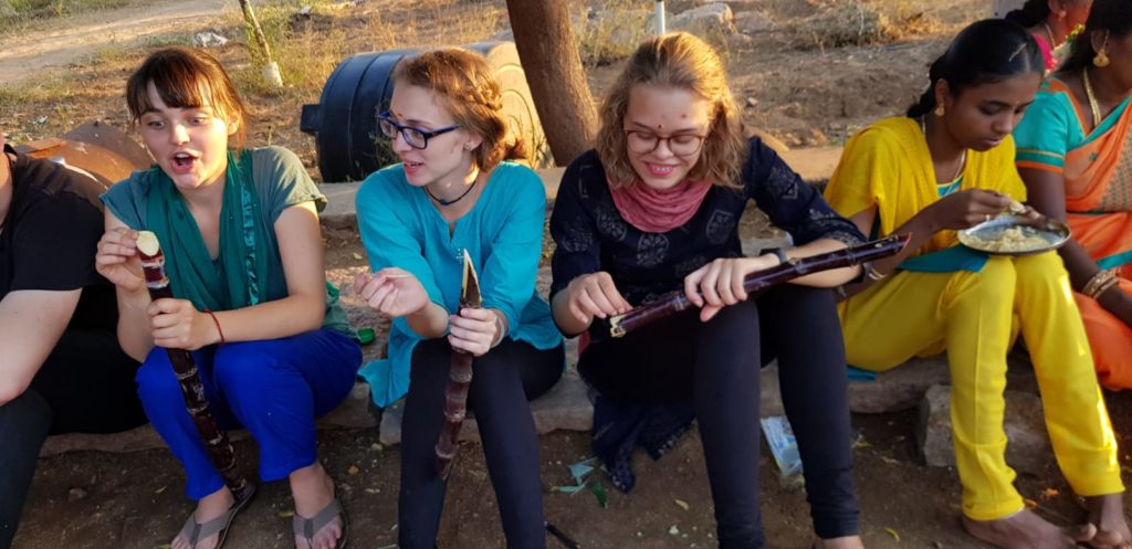 Als das Pongal fertig servierfertig war, wurden Teller verteilt und jeder bekam eine dicke Portion davon. Nach dem Aufräumen wurden dann noch die Zuckerrohre klein geschnitten und verteilt. Wir haben dann auch wie die Nagetiere immer ein Stück abgebissen, den Saft rausgekaut und die Holzfasern ausgespuckt.